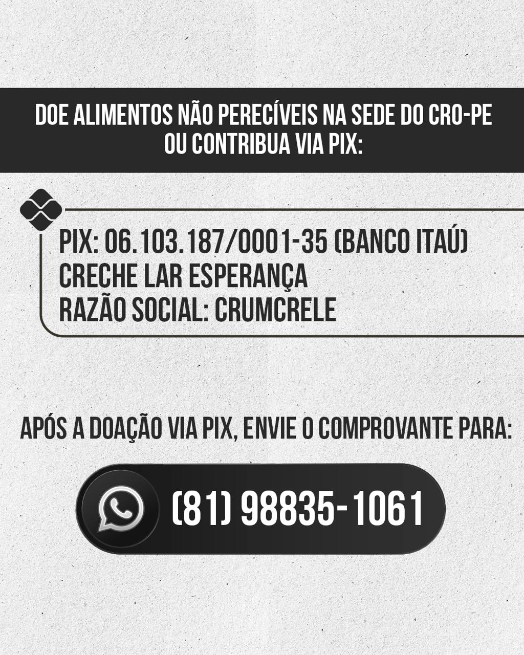 Após realizar a contribuição, os doadores devem enviar o comprovante para o whatsapp: (81) 98835-1061