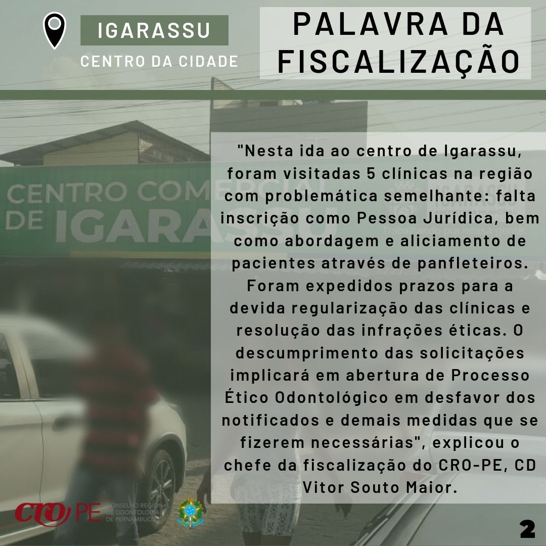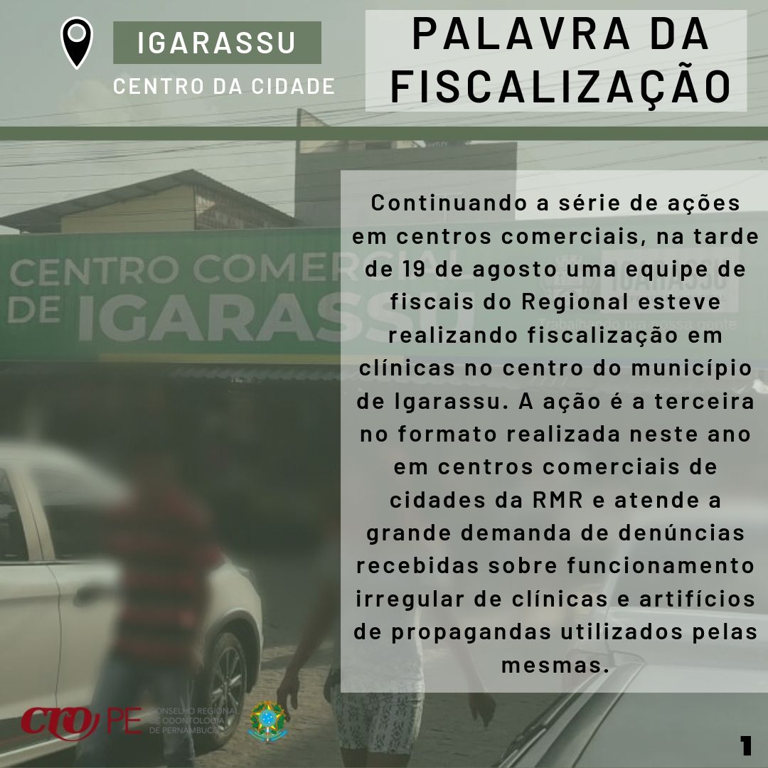 Continuando a série de ações em centros comerciais, na tarde de 19 de agosto uma equipe de fiscais do Regional esteve realizando fiscalização em clínicas no centro do município de Igarassu. A ação é a terceira no formato realizada neste ano em centros comerciais de cidades da RMR e atende a grande demanda de denúncias recebidas sobre funcionamento irregular de clínicas e artifícios de propagandas utilizados pelas mesmas.