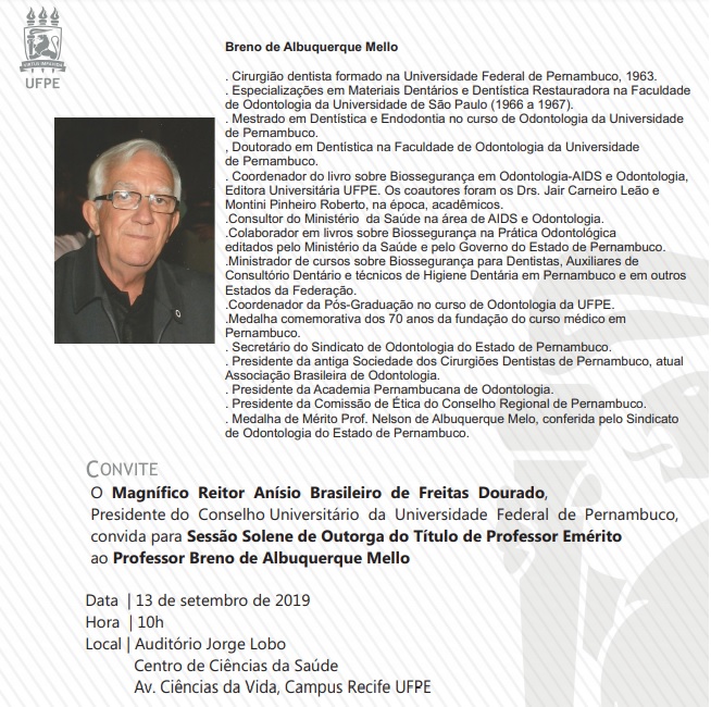 É com grande satisfação que divulgamos o convite da Sessão Solene de Outorga do Título de Professor Emérito ao Professor Breno de Albuquerque Mello, promovida pela Universidade Federal de Pernambuco - UFPE, na próxima sexta-feira, 13 de setembro de 2019. O Prof. Dr. Breno Mello, além de integrar a história da Odontologia, participa ativamente do Conselho. Atualmente, integra a Comissão da Memória da Odontologia Pernambucana e a Comissão Especial de Apoio à Presidência.