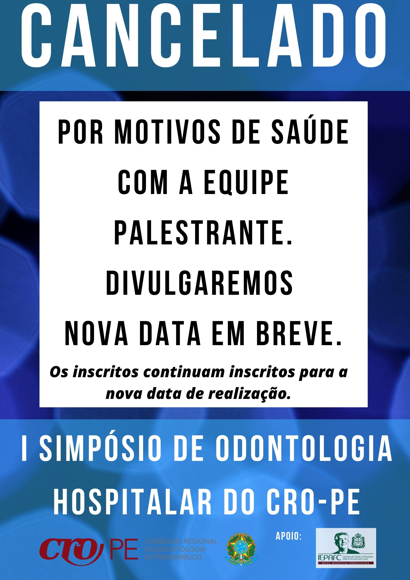 Infelizmente o I Simpósio de Odontologia Hospitalar do CRO-PE, que aconteceria no próximo sábado, 23/11/19, foi cancelado devido a questões de saúde com a equipe palestrante para a edição do evento. Uma nova data para a realização do Simpósio será divulgada assim que possível. Aos questão inscritos, informamos que a inscrição continua válida para a próxima edição. Pedimos desculpas pelo transtorno.