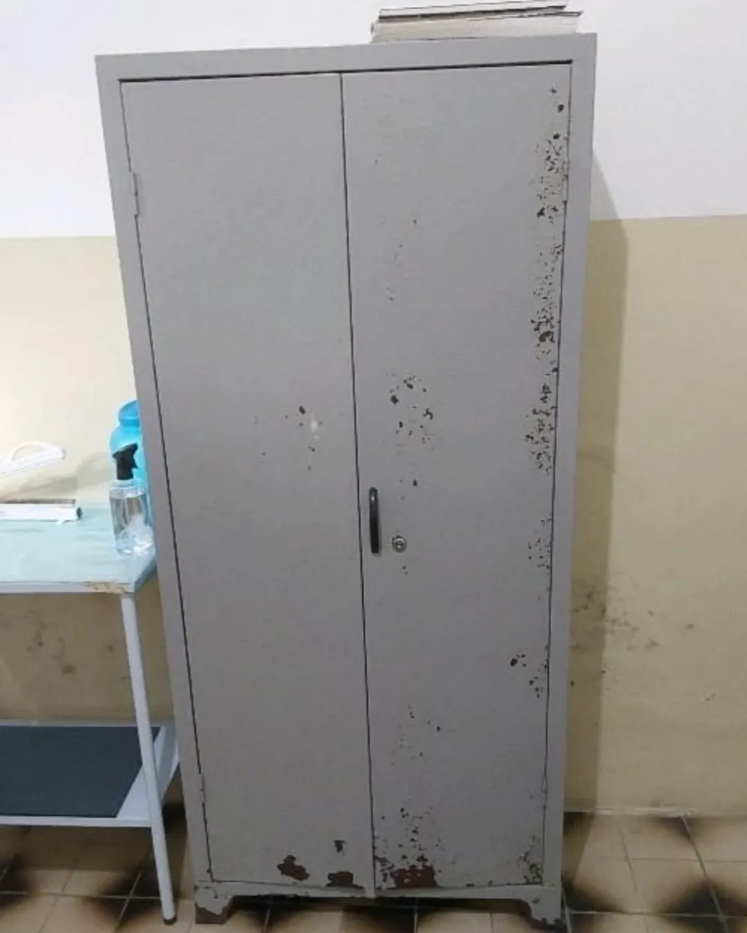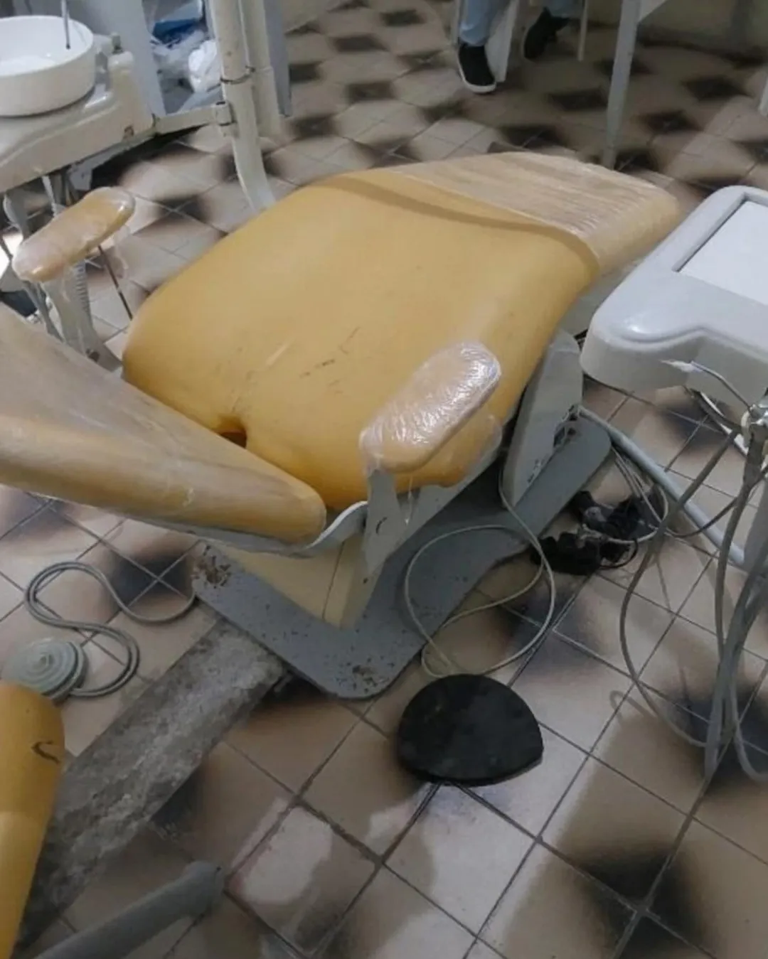 Durante a fiscalização, a equipe constatou paredes com infiltrações e mofo, bem como a ausência de placa de identificação. Foram observados móveis e equipamentos enferrujados, incluindo a cadeira odontológica e o armário. Também foi verificada a inexistência de autoclave no consultório, além de instrumentais sem data de esterilização e sem monitoramento adequado, em descumprimento às normas de biossegurança. O compressor de ar encontrava-se instalado de forma irregular, suspenso sobre uma escada.